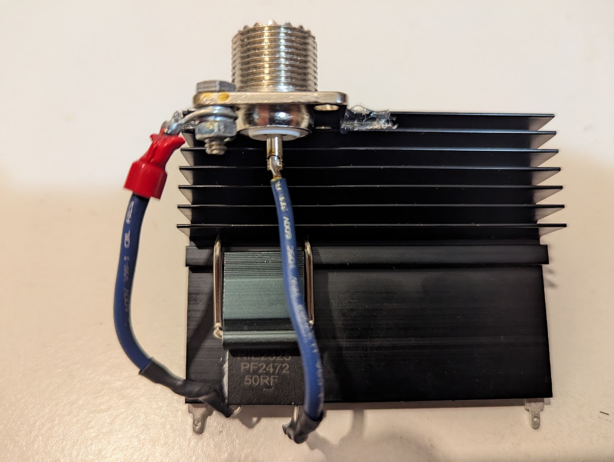 If you do the datasheet math (as you should!) it works out that this resistor and heat sink combo is rated for about 26.5W without airflow. In my case, I’m just going to keep the power levels to 20W or less when I use the dummy load. Even if I screw up, there is some margin for error here. With a 40W continuous carrier applied for 30s, the surface temperature of the resistor package raised by just 12C, and it cools down surprisingly quickly when the power is removed. At 100W it warms by 16C in 10s, so I do have to be careful. Worst comes to worst, the package has a UL-94 flammability rating of V0 - “Superior self-extinguishing with no flaming drips”. Pretty sweet. I expect I’d smell the hot glue before I pop the resistor - hopefully I never find out.